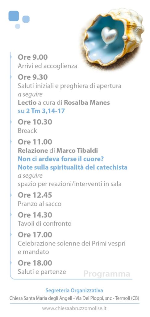 E’ in programma l’11 aprile 2026, a Termoli, il Convegno catechistico Regionale dal tema: “La spiritualità del catechista”. Sono invitati a partecipare tutti i catechisti della diocesi, previa iscrizione online entro SABATO 28 MARZO 2026.